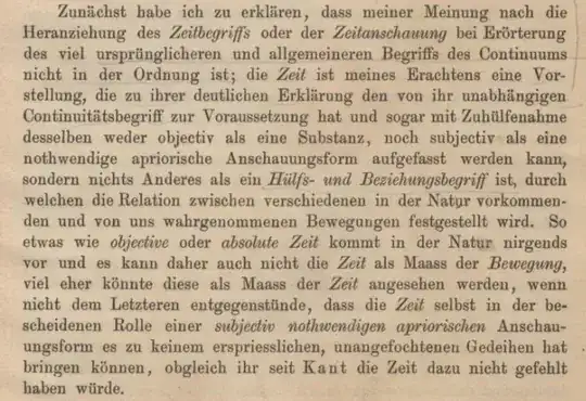 First of all, I have to declare the following: in my opinion it is not correct to adduce a concept of time or of a (intuitive-)view-on-time [translated intentionally non-idiomatically] if one explains the much more original and general concept of the continuum; I think that time is an idea which, in order to be explained clearly, presupposes the the concept-of-the-continuum, which is independent of time; also, even with the help of the concept-of-the-continuum, [time] can neither be objectively conceived of as a substance, nor subjectively conceived of as a necessary apriori form-of-intuition, rather time is nothing other than an auxiliary and relative concept, by which one determines the relation between distinct movements which occur in nature and are perceived by us. [Some would argue that Cantor is anticipating both Einstein and Barbour here.] Something like objective or absolute time nowhere occurs in nature and therefore one also cannot view time as a measure of movement, rather, to the contrary: movement could be viewed as a measure of time, were it not for the fact that, which contradicts the latter interpretation, that time, even in its modest role of a subjectively necessary apriori form-of-intuition, has failed to reach any fruitful, unchallenged state of prosperity [Cantor gets rather ornate at this point, and, in a sense, weakens his own case by negating an extreme condition ('time has not reached an unchallenged etc etc'; what wonder.)], even though it has had enough time to do so since K a n t.