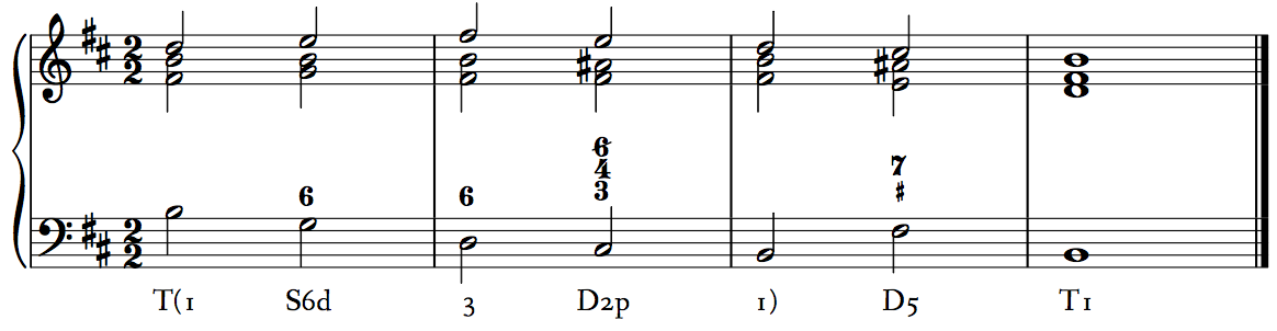 In this text, we primarily use the first method of Roman numerals and (prolonged) harmonic functions, since it is the most common in North American music theory. However, functional bass can be helpful for identifying categories of chords that belong together. For example, in a dictation or transcription task, we might hear re in the bass but not know what specific chord it is. If context tells us it is likely a dominant chord, rather than subdominant, we can label it D2. This rules out II (a subdominant chord) but keeps open multiple dominant options like V6/4 or VII6 until we are able to make a final determination. Similarly, when composing, there are patterns that might take an S4, with the specific chord (IV or II6) determined by voice-leading rather than harmonic syntax, but where a D4 chord (V4/2) would be syntactically inappropriate, regardless of voice-leading.