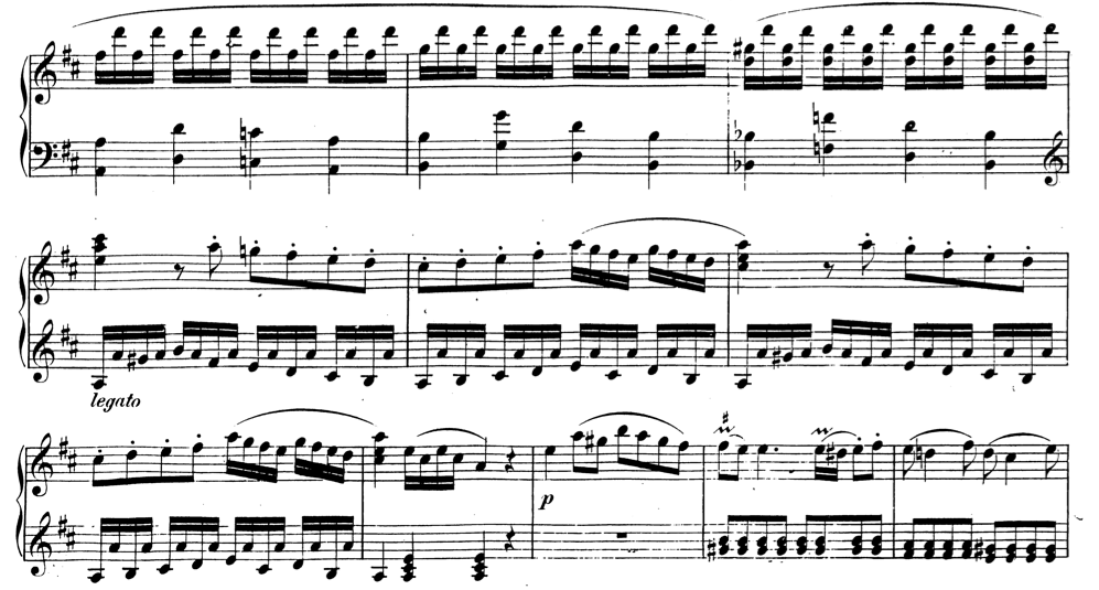 In the following example (from Mozart’s Piano Sonata in D major, K. 284), the transition’s continuation reaches an HC at the beginning of the second line (marked legato). The dominant is prolonged via a “standing on the dominant,” and the MC is reached 5 measures later, marked by “three hammer blows” in the left hand and a one-beat silence.