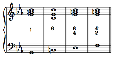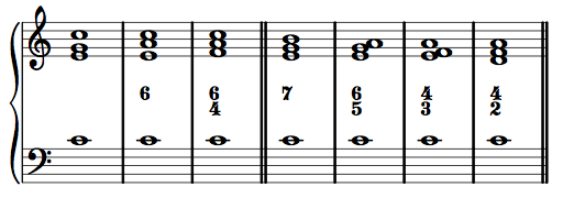 Only seven figures are given above. If you see a figure you do not recognize, simply follow the intervals (using the two shortcut rules). Likewise, if analyzing a chord that is not a triad or seventh chord, simply label the simple intervals you see/hear above the bass, from top to bottom in descending order: 7/6/3 or 5/4, for example. In time, you will become familiar with a number of other harmonic possibilities, and their corresponding figures.