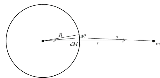 $$dM ~=~ \frac{M}{2}\sin\theta~ d\theta ~=~-\frac{M}{2}~d\cos(\theta) ~\stackrel{(1.4)}{=}~\frac{M}{2}\frac{s~ds}{rR}.\tag{1.5}$$