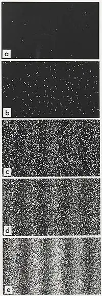 One would also analyse experiments such as that of the double slit with electrons. As stated above, today it is possible to detect the arrival of individual electrons, and to see the diffraction pattern emerge as a statistical pattern made up of many small spots. To obtain the statistical interference pattern you need to repeat the experiment during a period of time and superpose the results of each one of the individual runs in a final statistical figure