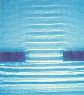 according to Huygens Principle light should always interfere with itself and create interference patterns no matter how and where you shine it. The key here is the sharp edges of the slit, and what actually happens at those edges. It has to do with turbulent flow and vorticity. (talking about the water here)
