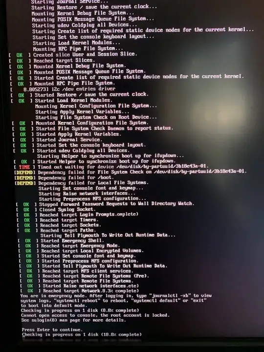 However, things go off the rails when I attempt to resize the partition from its regular ~4gb size to its full 2TB glory. I boot into the SD card's root filesystem, open up gparted, and resize the root partition to extend to the full disk. Then I go to boot and I'm greeted with a message indicating mounting and resizing the root partition failed and my system is in emergency mode.