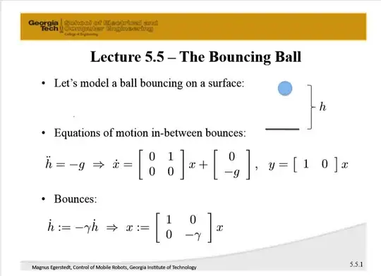 The matrix notation in the original posting is very illustrative, because it makes clear that bouncing balls have to do with mathematics and linear algebra. It is the lingua franca in science and should be used as much as possible to prevent the fuzzy logic enthusiasts from taking over our control-theory.