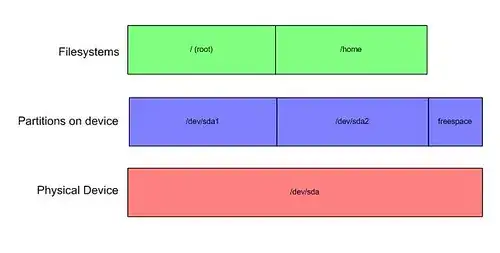You've got the actual drive, in this case sda. On that drive are two partitions, sda1 and sda2. There is also some unused free space. Each of the partitions has a filesystem on it, which is mounted. The actual filesystem type is arbitrary. You could call it ext3, reiserfs, or what have you. The important thing to note is that there is a direct one-to-one corrolation between disk partitions and possible file systems.