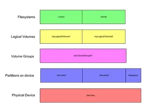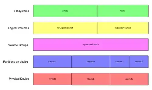 Now, you see the same partitions, however there is a layer above the partitions called a "Volume Group", literally a group of volumes, in this case disk partitions. It might be acceptible to think of this as a sort of virtual disk that you can partition up. Since we're matching our previous configuration exactly, you don't get to see the strengths of the system yet. You might notice that above the volume group, we have created logical volumes, which might be thought of as virtual partitions, and it is upon these that we build our file systems.