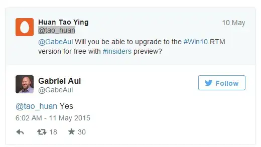 Gabriel from Windows team at Microsoft today confirmed on Twitter that Windows Insiders who are trying earlier Windows 10 builds can upgrade to Windows 10 RTM for free when it is released.
