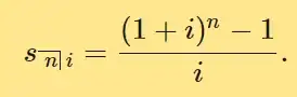 $s_{\actuarialangle{n}i}=\frac{(1+i)^{n}-1}{i}$