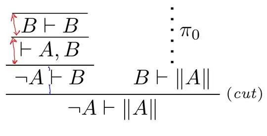 \begin{document} \begin{center} \AxiomC{} \UnaryInfC{$B \vdash B$} \UnaryInfC{$\vdash A,B$} \UnaryInfC{$\neg A \vdash B$} \AxiomC{} \RightLabel{$\pi_0$} \DeduceC{$B \vdash \lVert A\rVert$} \RightLabel{\scriptsize$(\mathit{cut})$} \BinaryInfC{$\neg A \vdash \lVert A\rVert$} \DisplayProof \end{center} \end{document}