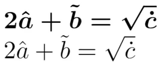 \unboldmath $2\hat{a} + \tilde{b} = \sqrt{\dot{c}}$