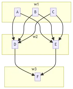 graphslibrary (for input syntax) would allow something like{A, B, C} -> [complete bipartite] {D, E} -> Ffor specifing the edges. Thegraphdrawinglibrary (need Lua!) with itslayeredlibrary would help in placing the nodes automatically. There's also sublayouts for the yellow boxes. – Qrrbrbirlbel Feb 14 '23 at 17:42graphslibrary as well. It doesn't do anything you can't do with nodes and edges already but the graphdrawing library kinda depends on it (and all the examples use it). – Qrrbrbirlbel Feb 14 '23 at 20:59\tikzMatrixNodeswith a few adjustments. – Qrrbrbirlbel Feb 14 '23 at 21:31
