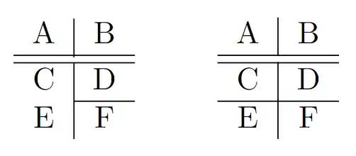 tabularrayinstead to avoid such problems. – samcarter_is_at_topanswers.xyz Dec 10 '23 at 13:33nicematrixpackage as it draws lines as one single stroke whereever this is possible. – Jasper Habicht Dec 10 '23 at 13:55\cellcolorbased on this computation. – Mew Dec 10 '23 at 13:59|add thearraypackage. – David Carlisle Dec 10 '23 at 16:13It's not the case for a standard \hline\hline so it shouldn't be for \hhline.er... that's like saying it's not the case that apples have orange skin so it shouldn't be the case for oranges. – David Carlisle Dec 10 '23 at 16:14\hhline{=...}with the goal that it looked like\hline\hline? – Mew Dec 10 '23 at 18:11|so the segments will overlap, althoiugh as I say xpdf does not make that noticable as far as I can see the array package version of tabular does not have that negative space. I could not reproduce the vertical line overlapping into the double hline gap. – David Carlisle Dec 10 '23 at 20:31