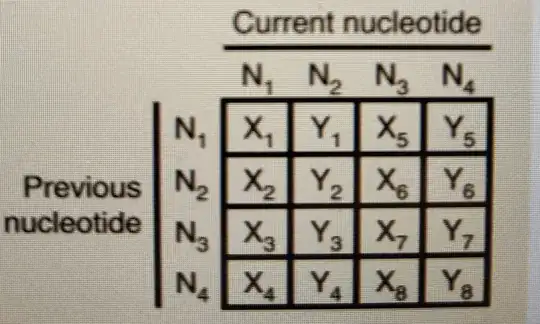 \begin{table}[h!] \begin{tabular}{ll|ll|ll} \multicolumn{6}{c}{Nächstes Nukleotid} \ \hline & & A & T & C & G \ \hline \multirow{3}{4em}{Vorheriges Nukleotid} & A & 0 & 1 & 1 & 0 \ & T & 1 & 0 & 0 & 1 \ & C & 1 & 0 & 0 & 1 \ & G & 0 & 1 & 1 & 0 \end{tabular} \caption{Übersetzung Regel 888} \end{table}