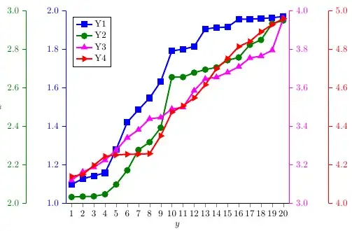 xlabel style=blackandylabel style=black. 2. You're overwriting thenumber formatdefinitions. Useevery y tick label/.prefix style={xshift=-1.5cm}. 3. Usetick style={blue}4. You'll have to add the legend images and entries manually, using\addlegendimage{color=mycolor2,mark=*...}\addlegendentry{Y2}. 5. Put something like\pgfplotsset{width=9cm, height=6cm}before the first plot.