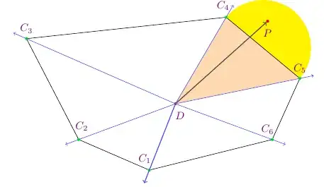 In a separate problem, I need to shade the whole region bounded by the extended arrows at C_4 & C_5 joined by a chord (that contains P) and D. I have changed to