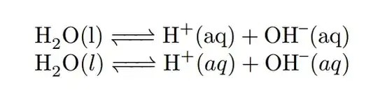 \ce{H2O\liq{} <=> H+\aq{} + OH^-\aq{}}