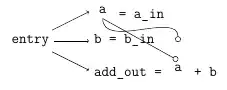 \node[below=.1cm of add-b-in.south west, anchor=north west] (add-return) {add\_out = \tikz[remember picture]\node(a-use){a}; + b};