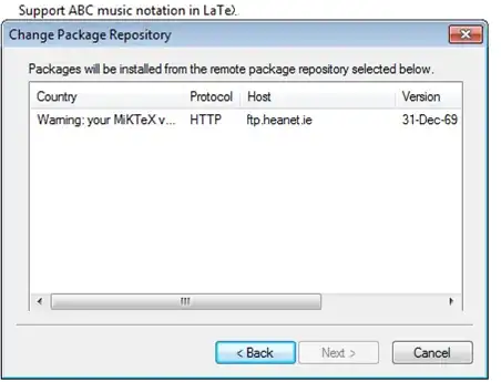 When I try to install packages or updates, this is the only repository available (see below). The Warning message says your MiKTeX version is outdated. When I tried to updated MiKTeX using this repository, I started having problems compiling tex files that used to work. This repository has been the only one available to me for about a week now -- on several machines in the same geographic location. Any suggestions?