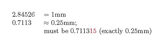 And \the\dimexpr 0.711319pt\relax outputs 0.71132pt. Thus 0.71132pt is the most accurate 5 digits representation (after testing it is the only one giving 46617sp internally) of the actual exact 0.25mm dimension. However as explained above, when TeX encounters 0.25mm it will obtain 46616sp. Using the bigger cm unit as in 0.025cm gives a greater loss of precision (46605sp).