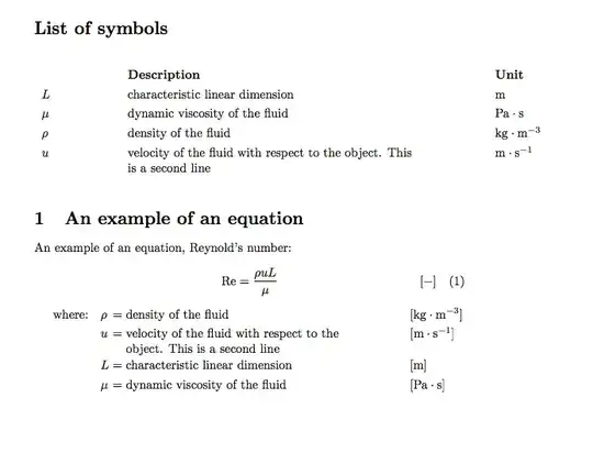 \usepackage{acronym}? Related: Add third column to acronym or Formal looking Symbols, Operators and Abbreviations section for thesis? – Bobyandbob Apr 30 '18 at 13:17siunitxpackage.unitsdefdoes not seem to be in active development (last update 2005 on CTAN). – BambOo Apr 30 '18 at 13:21siunitxhas quite a straightforward syntax, but I can uderstand your relunctance – BambOo Apr 30 '18 at 17:28\gls, but does provide an outcome as desired. I have created an Excel based solution as well. I am still kind of new to LaTeX but came up with this, see the answer below. I also like to use this Excel sheet as a tool to maintain the list of symbols in an efficient way within the Excel interface. – JohnShape Dec 03 '18 at 11:06