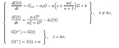 \lhsbox{\frac{dG(t)}{dt}} &= G_{in} - \sigma_2G - a\left(c+\frac{mI}{n+I}\right)G + b \\