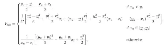 \dfrac1C \bigg[\dfrac{x_u^3-y_l^3}{6}+\dfrac{y_l^2+x_u^2}{2}x_l + (x_u-y_l)\dfrac{x_l^2}{2}+ \dfrac{y_u^2-x_u^2}{2}(x_u-x_l)& - (y_u-x_u)\dfrac{x_u^2-x_l^2}{2} \bigg],