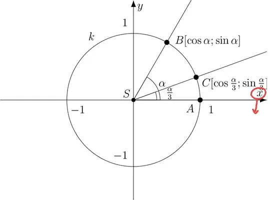 \draw[color=black] (1.522992684288592,0.2400490757514338) node {$C[\cos{\frac{\alpha}{3}}; \sin{\frac{\alpha}{3}}]$};