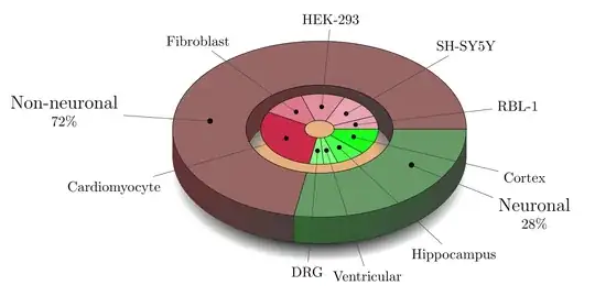 I'm trying to do a nested donut-shaped chart in tikz for the percentage of different cell types used in recent studies with MEA systems. The outer layer is divided in two: Non-neuronal and neuronal studies. And my inner layer is divided in the number of studies which comprise the neuronal and non-neuronal cells. I have the following questions: