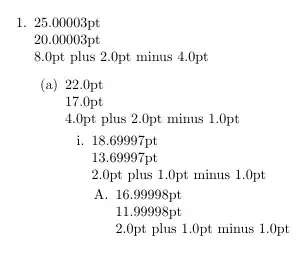 What registers store the default values for lenghts and glues of the Latex nested lists?