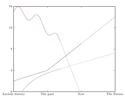 I'd like to add a dashed line to the end of a plot to indicate a future projection as opposed to real data. I can do this by adding a second plot, as in the example below. However this isn't really neat - its repeated code and doesn't lend itself to doing this with data pulled in using pgfplotstableread for example. Is there a way of changing linestyle for a selected section of a plot? ie saying that for the last segment of each plot should be in a different style?