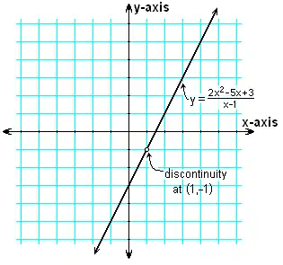 Reducing its (x-1) multiplicative inverse factors (reciprocals) to multiplicative identity (unity) leaves the factor (with implied universal-factor 1/1). Limiting this simpler function's domain; 'all except , where x is undefined' or simply 'and x ≠ 1' (implying 'and R2 '); equates it to the original function. This expression is a linear function of x, with slope m = 2 and a y-intercept ordinate of -3. The expression evaluates to -1 at x = 1, but function y is undefined (division by zero) at that point. There is a discontinuity for function y at x = 1. Practically the function has a sort of one-point hole (a skip), shown on the graph as a small hollow circle around that point. Lines, rays and line segments (and arcs, chords and curves) are shown discontinuous by dashed or dotted lines.