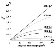 Fig. 7.3: The dependence of Dlog on projected thickness for a typical range of scatter-to-primary ratios (SPR).