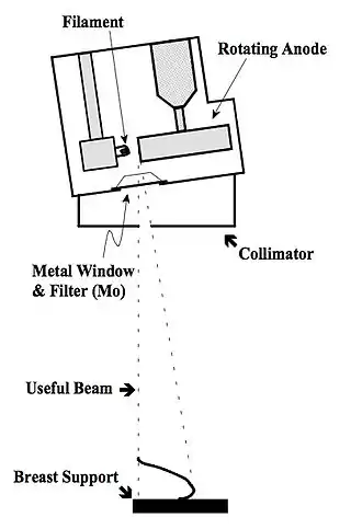 Mammography XRTs are generally constructed with a metal envelope, instead of the usual glass, with a thin beryllium (Be) exit port. This design has the advantage of suppressing extra-focal radiation. In addition, the tube can be constructed so that the anode-cathode axis is offset to achieve the small focal spot size - see Figure 7.23.