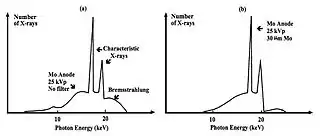 Molybdenum (Mo) can be used instead of tungsten as the anode material in the X-ray tube (XRT). The Mo energy spectrum consists of K-Characteristic lines between 17 and 19 keV and a Bremsstrahlung continuum - see Figure 7.22. The Bremsstrahlung can be attenuated using an added Mo filter which preferentially eliminates the low energy radiation, that would otherwise be completely absorbed by the tissues and contribute little to image formation, as well as higher energy X-rays which would otherwise degrade subject contrast. This is an example of the application of K-edge filtration.