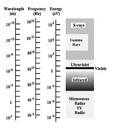 The spectrum is the broadest ranging physical phenomenon known to science. It can be seen in the figure to extend from waves with a wavelength of much greater than 1 meter to wavelengths less than a millionth, millionth, millionth of a meter. At these tiny wavelengths, the radiation can be considered to be small wave packets, which are also called photons. The spectrum can also be seen to encompass frequencies from less than a kHz to over 1024 Hz. Correspondingly, the energies range from less than 1 μeV to over 10 MeV.