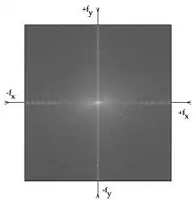 Fig. 1.27: 2D-FFT for a wrist radiograph showing increasing spatial frequency for the x- and y-dimensions, fx and fy, increasing towards the origin.