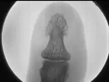 Recently awarded U.S.patent 7,426,258 describes a fluoroscopic camera which can achieve an intrinsic resolution of 18 lp/mm and is capable of magnifying the fluoroscopic image optically up to 40 times without resorting to geometric or digital pixel magnification. See: "Finger Tip" Fluoroscopic Image. This performance is achieved, in effect, by creating a very smooth shadow plane, positioning the specimen in close proximity to it, and then viewing the intensified shadow image optically with a zooming video camera. When the specimen is in close proximity to the shadow plane, the shadow sharpness is maximized and less influenced by the size of the focal spot. The closer the object is to its shadow, the sharper the shadow. The video camera employs a high- resolution, x-ray scintillator coating coupled to the input window of a non-demagnifying night-vision image intensifier. The fine detail from the scintillator image is intensified 30,000 times at the output window. That image is viewed optically with an auto-focusing, analog CCD camera capable of programmable zoom. The first important advancement realized from this development is a magnified, real-time fluoroscopic X-ray imaging system that isn’t dependent on micro-focal spot size, and the high costs associated with it. In addition, these new systems are compact and can record the fluoroscopic images as either dynamic video or static JPG.