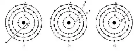 Remember from before that an ion results following the removal of an electron from an atom. We can say from this perspective that the Ionization Potential of the K-shell is 69.5 keV, while that of the L-shell is 10.2 keV - and so on. What is of interest to us here is what happens following such an ionization process.