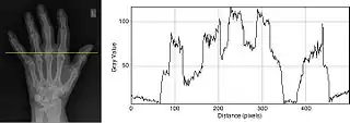1.23: A profile plot for the yellow line indicated in the radiograph.