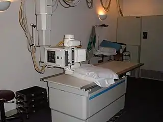 Applications areas include the oesophagus, stomach and colon (using barium-based contrast media) as well as phlebography, myelography and vascular studies (using iodine-based contrast media), urology and weight-bearing skeletal studies. Generally, the XRT, image receptor and patient table are attached to each other mechanically - see Figure 1.20 - although it is also possible for the XRT and receptor to be mounted on a structure such as a C-arm - see this photo - to allow improved flexibility.