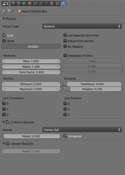 Please set the cube's physics to Dynamic in the first pull down menu. This means that the cube will fall, bounce, bounce back and basically act as a normal object in our world beyond the computer. The panel should now look like this: