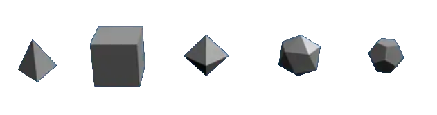 The Platonic solids or Platonic polyhedra are the convex polyhedra where all faces are copies of the same regular polygon, and the same number of edges meet at every vertex. There are five of these shapes: the tetrahedron (like a pyramid but with a triangular base): cube, octahedron, dodecahedron and icosahedron.