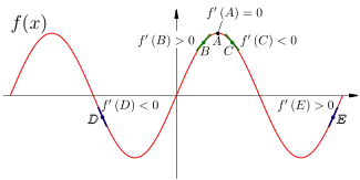 At any extremum, the slope of the graph is necessarily 0 (or is undefined, as in the case of ), as the graph must stop rising or falling at an extremum, and begin to head in the opposite direction. Because of this, extrema are also commonly called stationary points or turning points. Therefore, the first derivative of a function is equal to 0 at extrema. If the graph has one or more of these stationary points, these may be found by setting the first derivative equal to 0 and finding the roots of the resulting equation.
