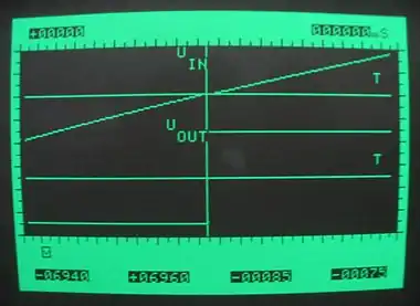 Transfer characteristic. Microlab can help us to obtain this curve on the screen. There is no time in this graphical presentation; there is only input and output quantities. We might discern three regions on this curve: negative saturation (large), active region (narrow) and positive saturation (large).