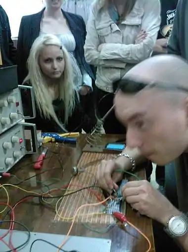 In order to carry out Ohm's experiment, we needed some kind of resistive wire. Our teacher gave us a heater wire, so we start experimenting with it. When we connected it with conductors, power supply, voltmeter and an ammeter we start measuring its resistance. We were also using two kinds of voltmeters and ammeters - old-fashioned movement ones and new digital devices. After our successes in building and connecting the scheme, we were very excited to find it actually worked. The images around show our scheme and progress.