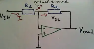 If we have voltages with different polarity and VIN1 and VIN2 are selected so that VOUT=0 (point known as "virtual ground") we have a comparing device,like in the scheme in the third picture:VIN2/VIN1 = -(r2/r1).To keep Vout = 0 we can use operational amplifier(down).Here I1.R1=(VIN/R1).R2 or VOUT/VIN=-R2/R1.