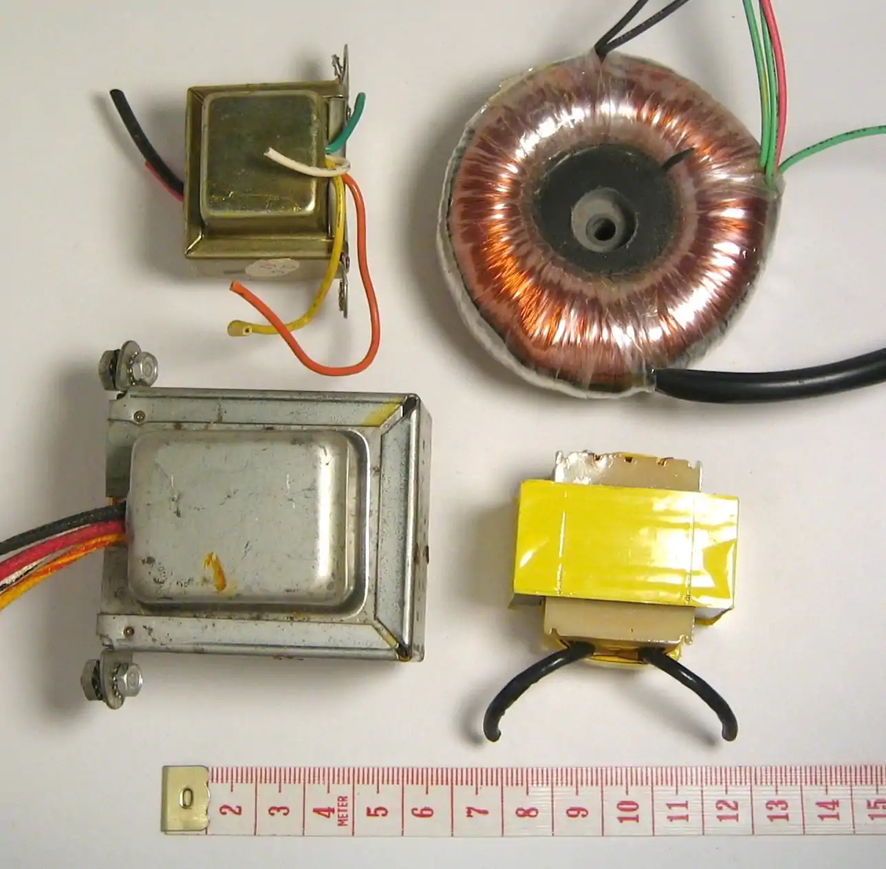 The following photo shows several examples of the construction of inductors and transformers. At the upper right is a toroidal core type (toroid is the mathematical term for a donut shape). This shape very efficiently contains the magnetic flux, so less power (or signal) is lost to heating up the core.