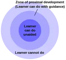 Zone of proximal development: A concept created by Vygotsky that describes the area of learning between what a student is capable of doing by themselves, and what they can do with help, i.e., from a teacher, parents, or caregiver.