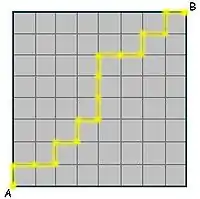 1. Picture a small town center, where the streets form an 8x8 square grid, as illustrated in the diagram. How many ways are there to travel from one corner (A) of the town center to the opposite corner (B)?